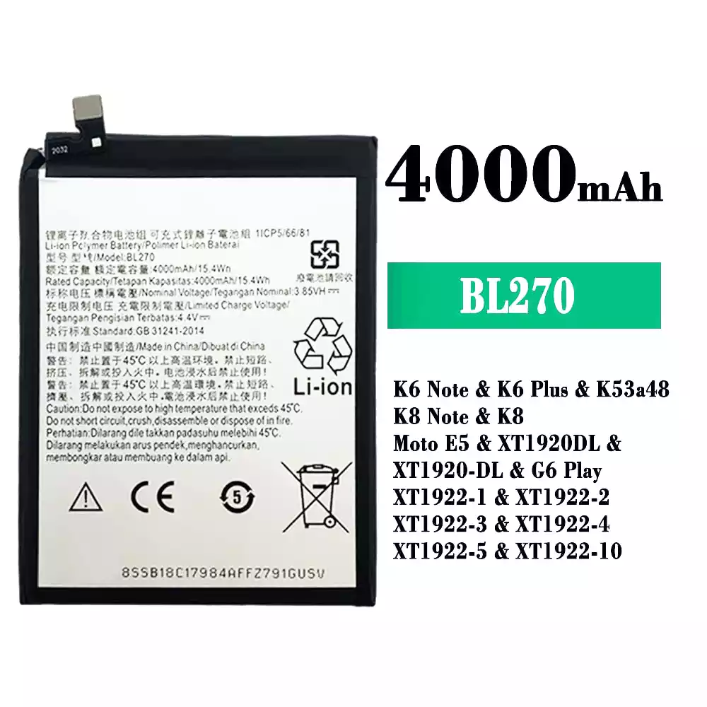 Akku BL270 alkalmas Lenovo K6 Note / K6 Plus / K53a48 / K8 Note / K8 / Moto E5 / XT1920DL / XT1920-DL / G6 Play / XT1922-1 / XT1922-2 / XT1922-3 / XT1922-4 / XT1922-5 / XT1922-10